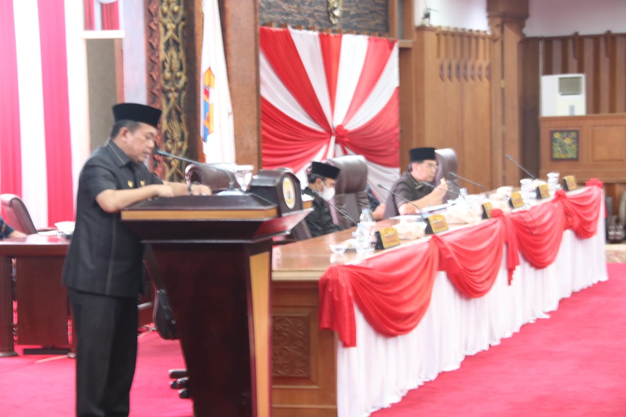 JAMBI, denyutjambi.co – Gubernur Jambi, Dr.H.Al Haris,S.Sos.,M.H., mengapresiasi pandangan umum fraksi fraksi Dewan Perwakilan Rakyat Daerah (DPRD) Provinsi Jambi sebagai catatan bagi Pemerintah Provinsi Jambi untuk lebih meningkatkan kinerja. Hal tersebut disampaikan Al Haris pada Rapat Paripurna DPRD Provinsi Jambi dalam rangka Penyampaian Pemerintah terhadap Pandangan Umum Fraksi Fraksi atas Ranperda Pertanggungjawaban Pelaksanaan APBD Provinsi Jambi Tahun Anggaran 2021, bertempat di Ruang Rapat Utama Gedung DPRD Provinsi Jambi, Jumat (15/07/2022).