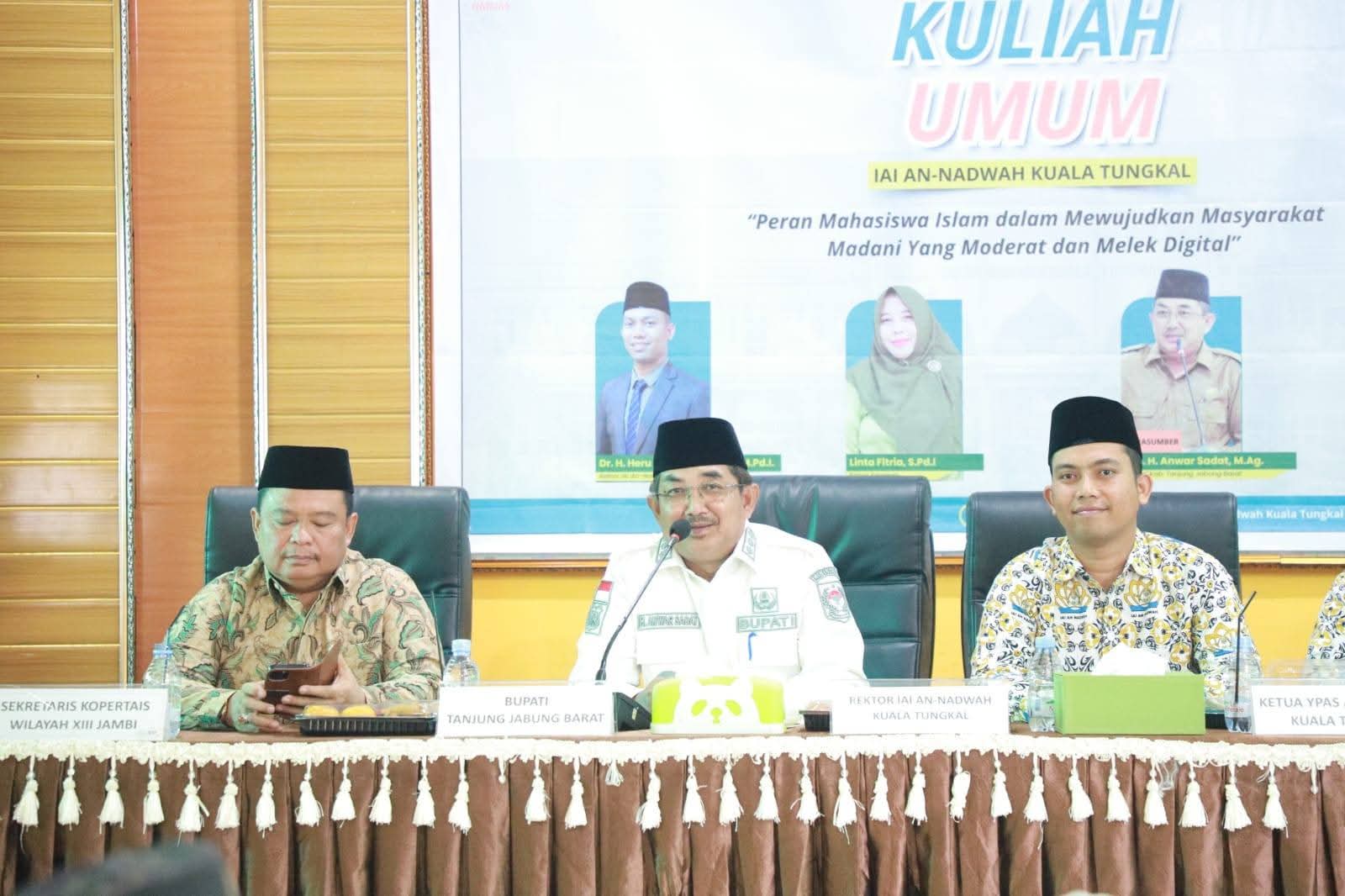 KUALA TUNGKAL, Denyutjambi.com – Bupati Tanjung Jabung Barat (Tanjab Barat), Drs. H. Anwar Sadat, M.Ag., memberikan kuliah umum di Institut Agama Islam (IAI) An-Nadwah Kuala Tungkal dengan tema “Mewujudkan Masyarakat Madani yang Moderat dan Melek Digital”, Rabu (03/9/2025). Acara berlangsung di Aula Kampus IAI An-Nadwah dan dihadiri jajaran pimpinan kampus, dosen, serta ratusan mahasiswa.
