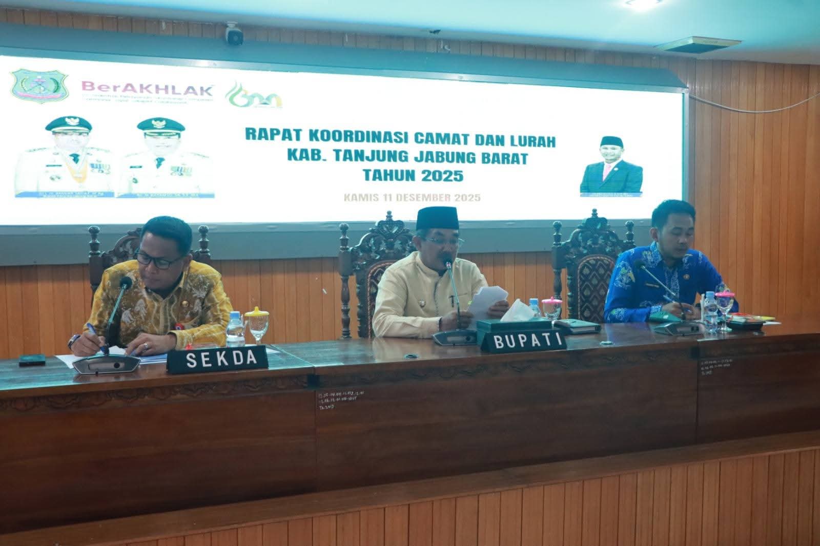 Kuala Tungkal, Denyutjambi.com – Bupati Tanjung Jabung Barat (Tanjab Barat), Drs. H. Anwar Sadat, M.Ag., menekankan pentingnya peran camat dan lurah sebagai ujung tombak pelayanan publik dalam Rapat Koordinasi (Rakor) Camat dan Lurah se-Kabupaten Tanjung Jabung Barat yang digelar di Ruang Pola Utama Kantor Bupati, Kamis (11/12/2025).