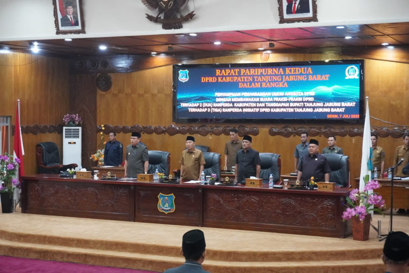 KUALA TUNGKAL, Denyutjambi.com – Dewan Perwakilan Rakyat Daerah (DPRD) Kabupaten Tanjung Jabung Barat (Tanjab Barat), menggelar Rapat Paripurna dengan agenda Penyampaian Nota Pengantar terhadap 2 Rancangan Peraturan Daerah (Raperda) usulan Pemerintah Kabupaten Tanjung Jabung Barat serta 3 Raperda Inisiatif DPRD, Senin (07/7/2025), di Ruang Rapat Utama DPRD Tanjab Barat.