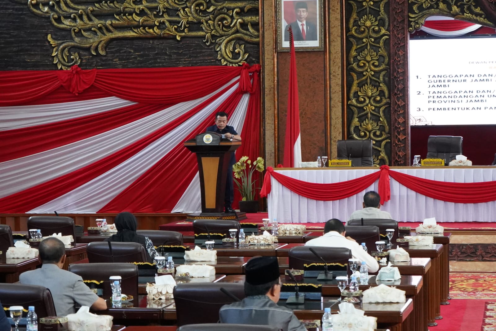 “Saya mengucapkan terima kasih dan apresiasi setinggi-tingginya atas tanggapan, pertanyaan, dan saran yang disampaikan oleh masing-masing Fraksi DPRD Provinsi Jambi. Pada prinsipnya yang disampaikan tersebut merupakan masukan yang sangat berharga bagi Pemerintah Provinsi Jambi, sehingga ketiga Ranperda nantinya dapat menjadi payung hukum yang implementatif,” ucap Gubernur Al Haris.