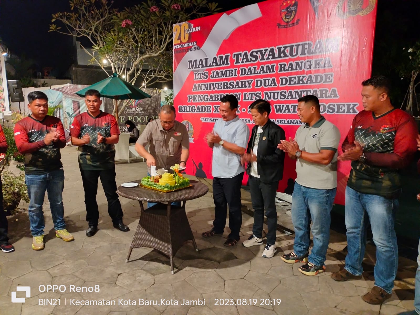 JAMBI, denyutjambi.com – Dalam rangka mewujudkan rasa syukur atas pengabdian selama 20 tahun dari tahun 2003 ke tahun 2023, LTS Jambi menggelar malam Tasyakuran Anniversary Dua Dekade Pengabdian LTS Nusantara Brigade XXXIX – 2023 Watukosek di Rumah Kito Hotel Resort pada Sabtu malam (19/8/23).