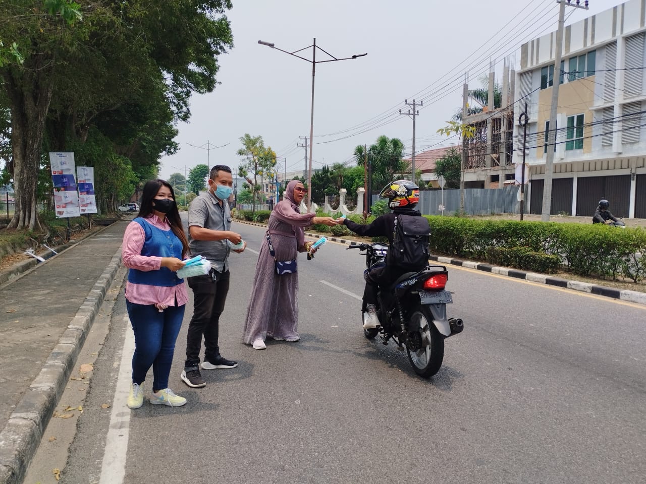 Tidak hanya itu, owner RS Erni Medika Erniana juga turut serta turun kejalan untuk bagi-bagi masker kepada pengguna jalan bersama Pengurus Ikatan Wartawan Online (PW IWO Jambi).