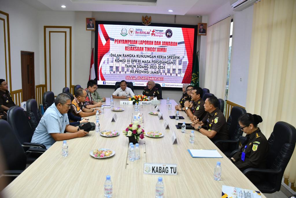 JAMBI, denyutjambi.com – Kepala Kejaksaan Tinggi (Kajati) Jambi Elan Suherlan menyambut kunjungan kerja spesifik Komisi III DPR RI masa persidangan tahun 2023 di Kejati Jambi (5/09/23).