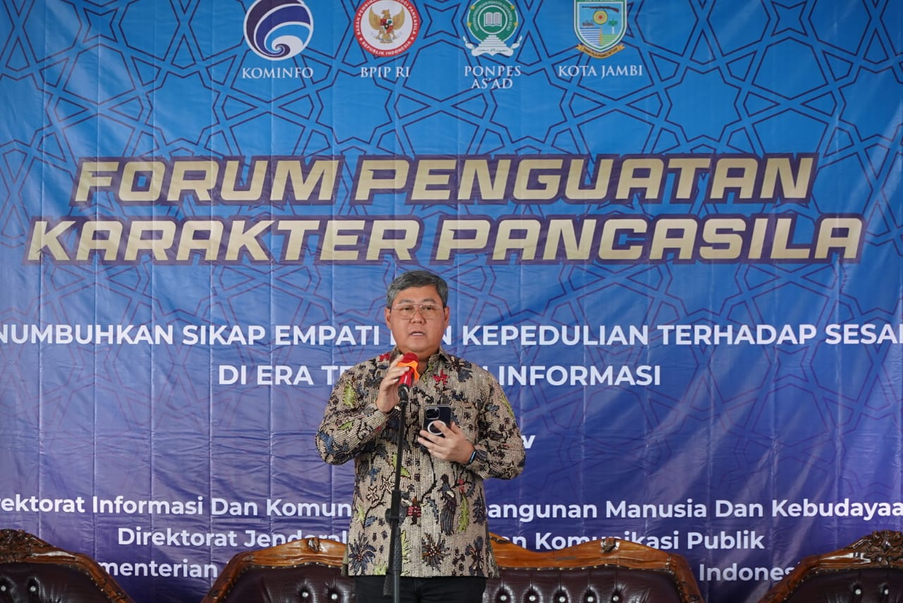 JAMBI, denyutjambi.com – Ditjen (Direktorat Jenderal) Informasi dan Komunikasi Publik Kementerian Komunikasi dan Informatika (Kominfo) Republik Indonesia bekerjasama dengan Pondok Pesantren As’ad Kota Jambi menyelenggarakan Forum Diskusi Publik dengan tema “Menumbuhkan Sikap Empati dan Kepedulian Terhadap Sesama di Era Teknologi Informasi”, bertempat di Aula Tribun Pondok Pesantren As’ad, Jalan KH. Abdul Qadir Kelurahan Olak Kemang Kecamatan Danau Teluk, Kota Jambi, Kamis (21/03/2024).