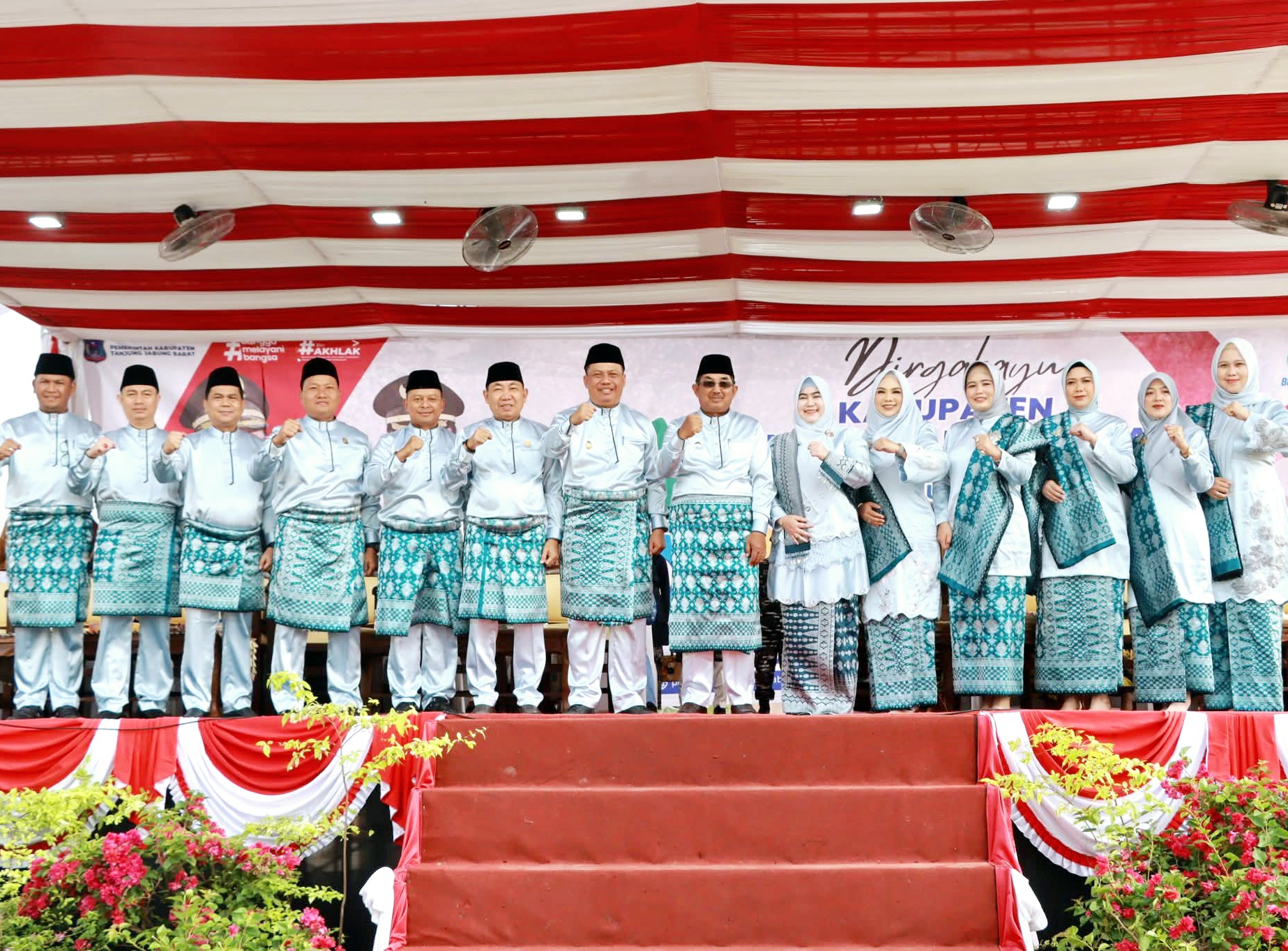 Bupati Tanjab Barat, Drs. H. Anwar Sadat, M.Ag., bertindak sebagai pembina upacara, didampingi Wakil Bupati Dr. H. Katamso SA, SE., ME.. Sejumlah pejabat, mulai dari Kepala Pengadilan Agama, Sekretaris Daerah, Ketua TP PKK, Ketua GOW, Ketua DWP, pimpinan instansi vertikal, BUMN, BUMD, hingga tokoh masyarakat, hadir memberi penghormatan pada momentum bersejarah tersebut.