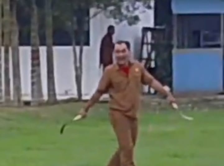 Dari vidio beredar, tampak setelah oknum guru dan para pelajar saling adu jotos didalam sekolah, oknum guru mengayunkan dua celurit cukup besar seraya mengancam para pelajar dengan mengatakan ” Mati Kau “.