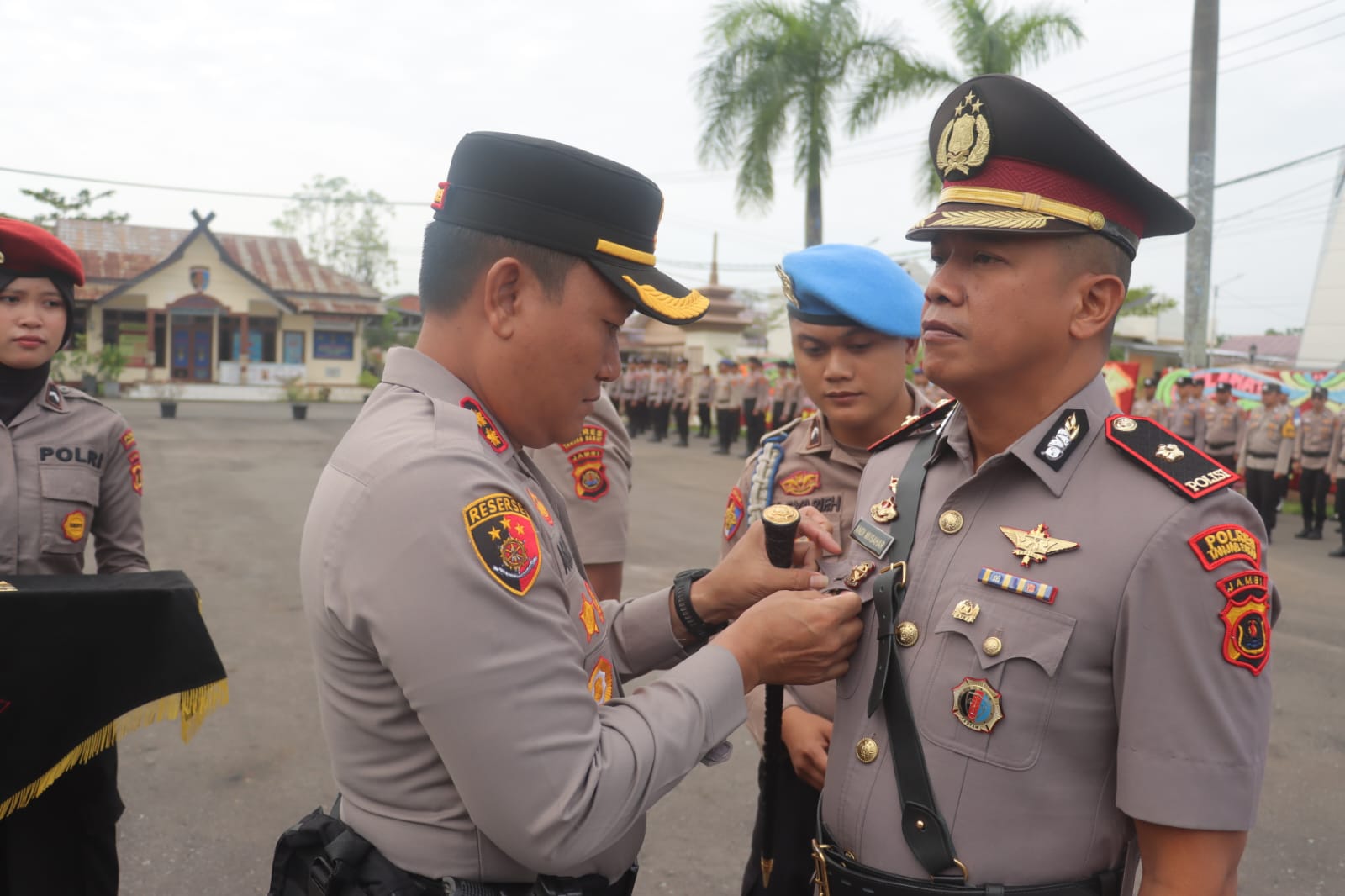 Upacara Sertijab dihadiri Ketua Bhayangkari Cabang Tanjab Barat Ny. Mutya Agung, para Pejabat Utama (PJU) Polres Tanjab Barat, Kapolsek jajaran, personel Polri, serta Aparatur Sipil Negara (ASN) di lingkungan Polres Tanjab Barat.