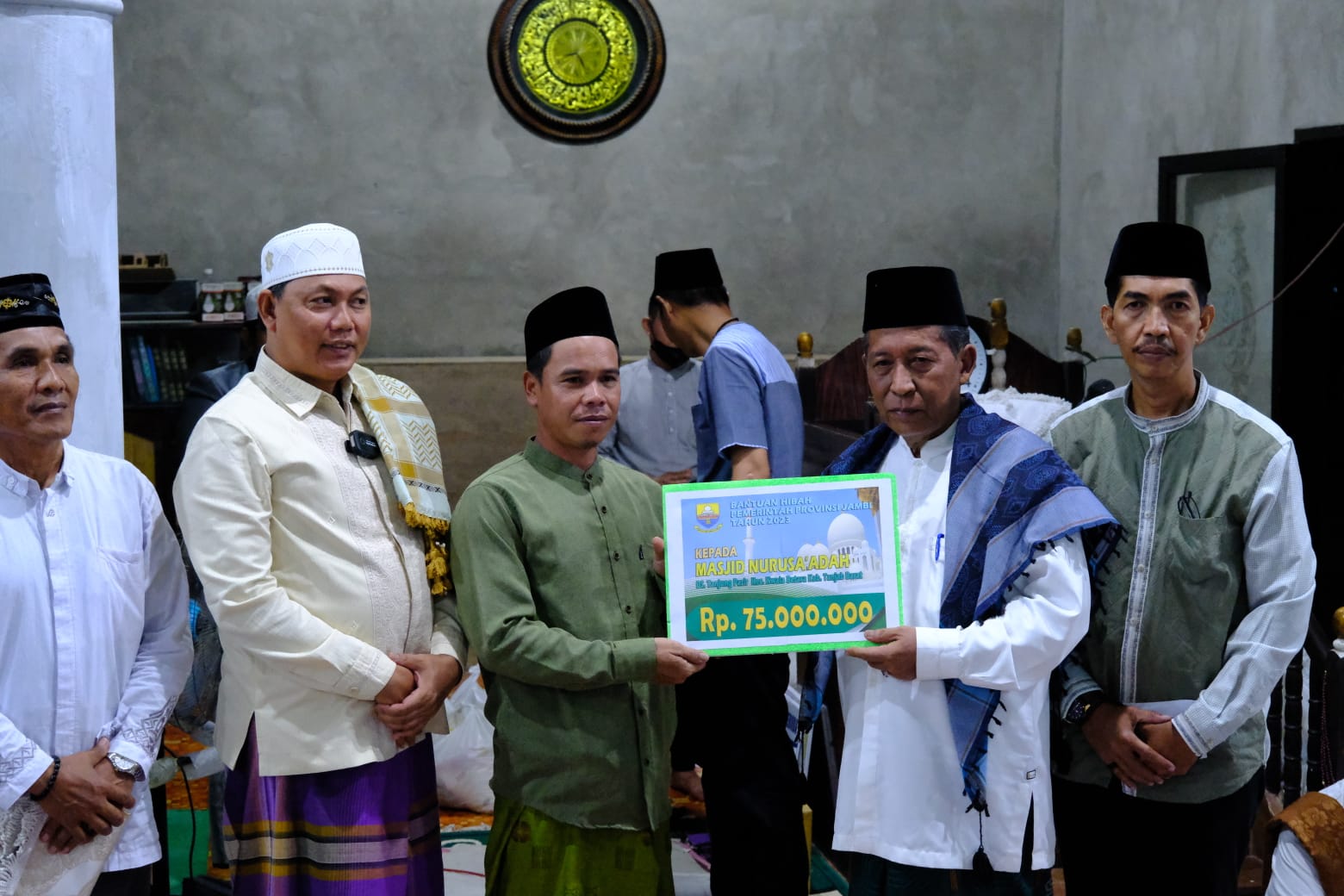 Pada kesempatan tersebut Wagub Sani menyalurkan bantuan secara langsung berupa 100 paket sembako untuk kaum dhuafa, 150 amplop untuk anak yatim dan uang tunai sebesar Rp.75 Juta untuk pembangunan Masjid Masjid Nurussaadah.