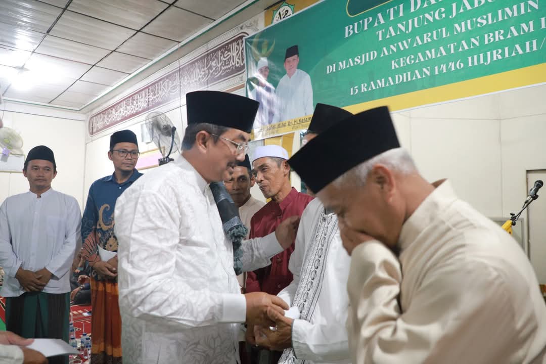 Tanjab Barat, Denyutjambi.com – Bupati Tanjung Jabung Barat (Tanjab Barat), Drs. H. Anwar Sadat, M.Ag., mengajak para Camat dan Kepala Desa untuk mencintai wilayah kerja mereka serta menghadapi setiap permasalahan yang ada dengan penuh tanggung jawab. Hal ini disampaikannya saat melaksanakan Safari Ramadhan di Masjid Anwarul Muslimin, Desa Jati Emas, pada Sabtu (15/3/2025).
