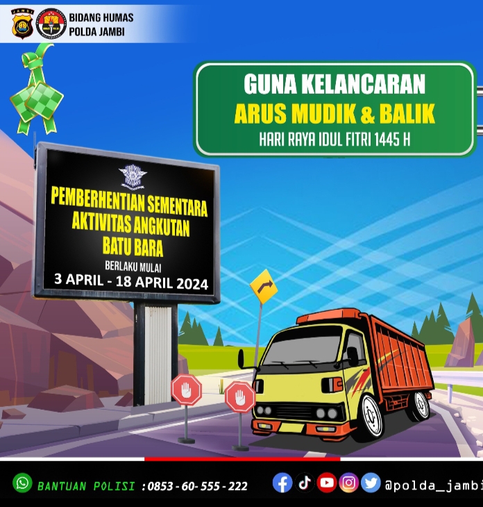 denyutjambi.com, JAMBI – Direktorat Lalu Lintas (Ditlantas) Polda Jambi akan memberhentikan sementara aktivitas mobilisasi angkutan batu bara selama arus mudik dan arus balik Hari Raya Idul Fitri 1445 H.